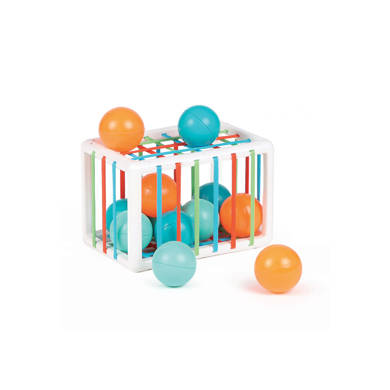 Ce jeu aéré et coloré attise l’intérêt des enfants. Les faces ouvertes du cube, reliées par des élastiques tendus, sont très faciles à agripper. Les enfants travaillent leur dextérité et leur force pour faire entrer les 12 balles à travers les élastiques. Ils usent ensuite de stratégie pour essayer de les sortir. En manipulant le cube, les enfants découvrent qu’il y a des faces plus faciles que d’autres pour laisser entrer les balles. Un jeu amusant qui va développer leur dextérité de façon ludique.