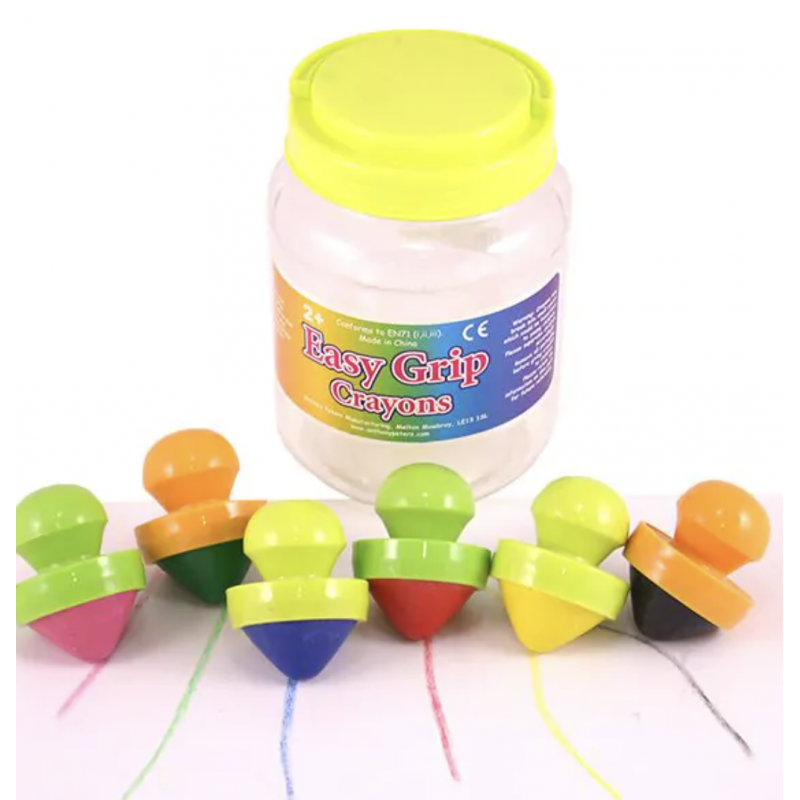 rouge, jaune, bleu, rose, vert, noir avec poignées en plastique. Ces crayons sont spécialement conçus pour les enfants de 2 ans et plus et ont des poignées ergonomiques idéales pour les petites mains. Ils sont présentés dans un bocal avec un couvercle et une poignée en plastique et sont disponibles sous forme de recharges.
