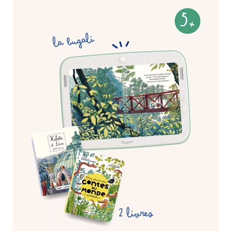 Ce pack contient la tablette sans écran Bugali et 2 livres : Hulotte et Léon (Juliette Lagrange, Kaléidoscope) et Mes premiers contes du monde entier (Charlotte Grossetête & Mylène Rigaudie, Fleurus).