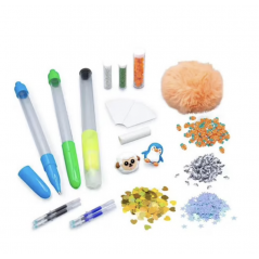 Remplis les stylos et le surligneur avec toutes les décorations puis choisis une figurine ou un pompon ! C’est magique ! Si tu frottes avec la figurine, l’encre des stylos s’efface. Le coffret permet de créer et customiser 2 stylos à encre effaçable et 1 surligneur. Pour les stylos, 2 mines de rechange d’encre sont incluses. Notice illustrée en couleurs.
