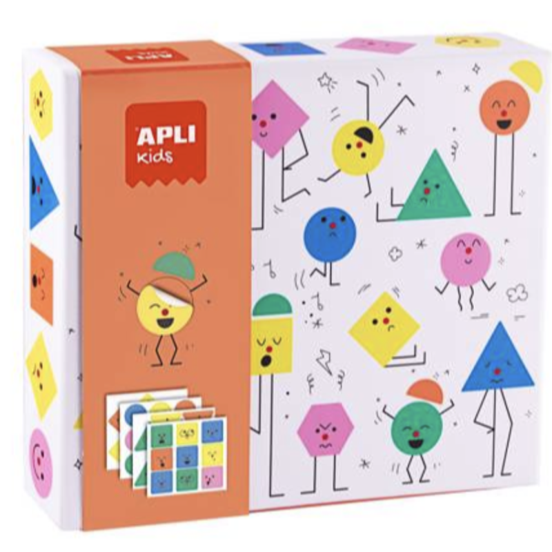 Jeu de gommettes géométriques "Émotions" dans une boîte en carton. Le but du jeu est de compléter les illustrations avec des gommettes géométriques de différentes formes, tailles et couleurs.