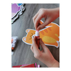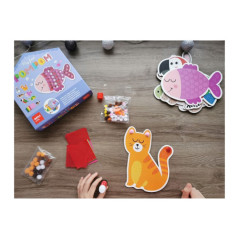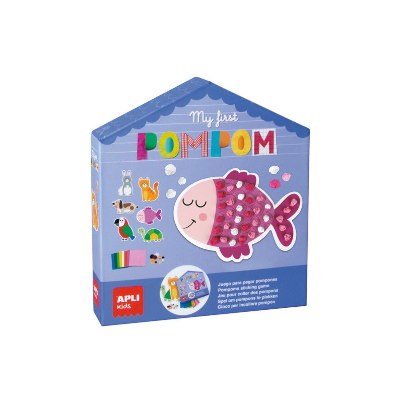 Kit de jeu Apli My First Pompom convient aux enfants à partir de 3 ans. L'enfant décore les fiches d'animaux avec des pompons et des boulettes de papier.