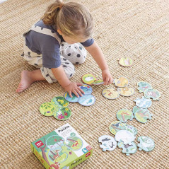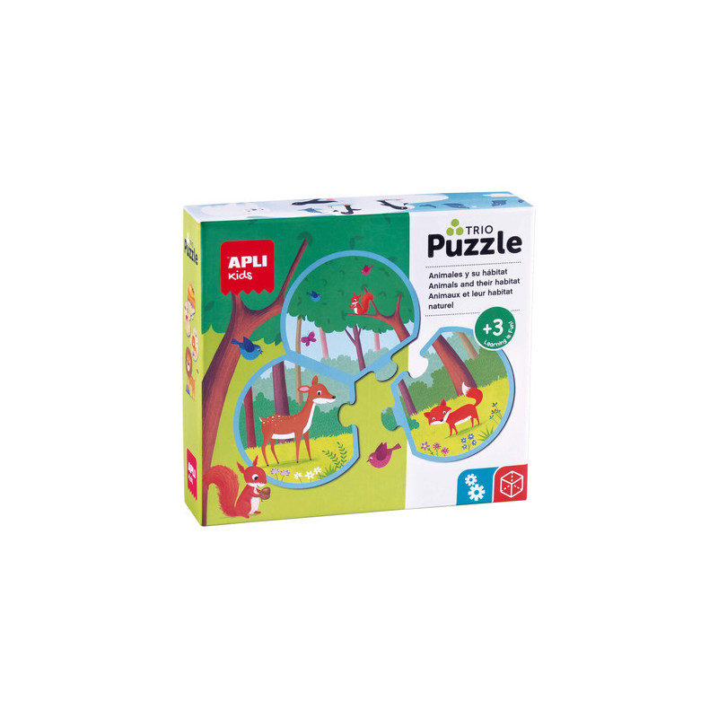 Trio de puzzle pour associer les animaux et leur habitat. Contient 24 pièces arrondies de Ø 9 cm pour réaliser 8 puzzles différents de 3 pièces.