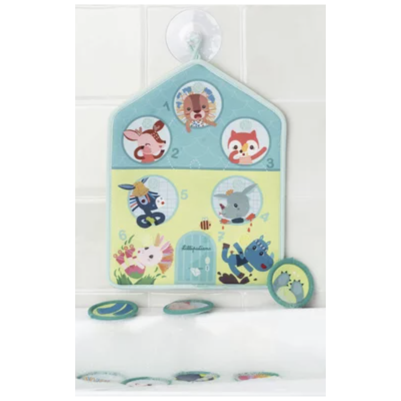 Avec ce panneau , le rituel du bain devient un moment de plaisir et d'apprentissage ! Grâce à la ventouse, le panneau se fixe facilement sur la paroi du bain. àprès une journée bien remplie, nos amis sont un peu sales mais pas de panique... C'est l'heure du bain ! Chacun a une zone de son corps à laver. Des pastilles qui représentent ces parties du corps propres flottent dans l'eau du bain. L'enfant s'amusera à chercher la pastille correspondant à la partie du corps sale et la placera au bon endroit sur le panneau. Il pourra même s'amuser à laver sa propre partie du corps en même temps.