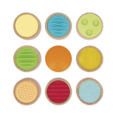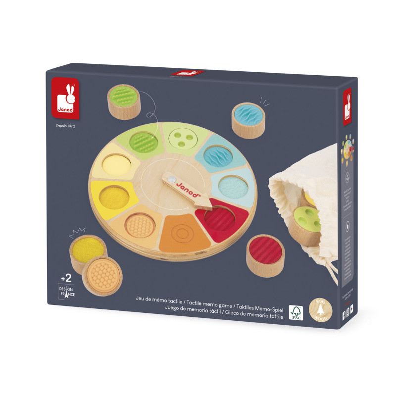 Découvrez la roue sensorielle de Janod ! Voici un jeu de mémo tactile pour les plus petits. Il suffit de faire tourner la flèche sur le plateau et de retrouver dans le sac en coton la pièce correspondante, juste en la touchant ! Le jeu se compose de 9 pièces en bois avec des textures et des matières différentes : feutrine, scratch, surface plane, bois texturé (2 pièces) et silicone texturé (4 pièces). Développe le sens du toucher et la coordination main/oeil. Jouet en bois FSCTM. Jouet d'éveil pour les enfants à partir de 2 ans.