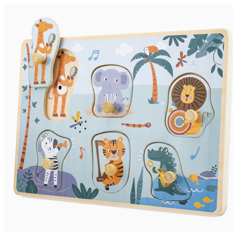 Il s'agit d'un puzzle sonore en bois composé de 6 pièces avec boutons. Chaque pièce est associée à un instrument de musique, et lorsque celle-ci est correctement placée, le son correspondant à l'instrument est émis. Un boitier de piles avec un bouton on/off est inclus. Ce jouet nécessite 2 piles de type AAA, qui sont fournies.