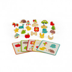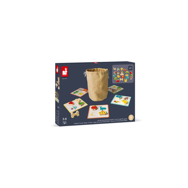 Pris la main dans le sac ! Ce jeu de reconnaissance tactile en bois va permettre aux enfants dès 2 ans de développer leurs sens et notamment le toucher. Le but du jeu est simple, chaque joueur choisit un carton de jeu. Ensuite, tour à tour ils devront mettre la main dans le sac qui contient les pièces en bois afin de piocher une des pièces présente sur le carton en utilisant seulement le toucher, comme s'il jouait au loto. Mais attention à la pièce « piège » ! Celui qui tombe sur l'os doit remettre toutes ses pièces déjà gagnées dans le sac. Pour les plus petits : on pioche simplement une pièce et si elle figure sur son carton, on la pose dessus. Le premier à remplir son carton a gagné ! Ce jeu de 2 à 5 joueurs contient 21 pièces en bois, un sac en coton et 5 cartons de jeu.