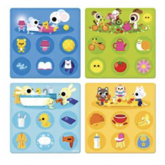 Le jeu se compose de 4 planches représentant chacune une pièce de la maison : la cuisine, la salle de bain, la chambre et le jardin. L'enfant découvre une scénette sur le haut de la planche reprenant tous les éléments recherchés. Il est donc possible d'utiliser le jeu comme un cherche et trouve.