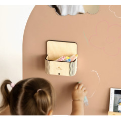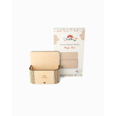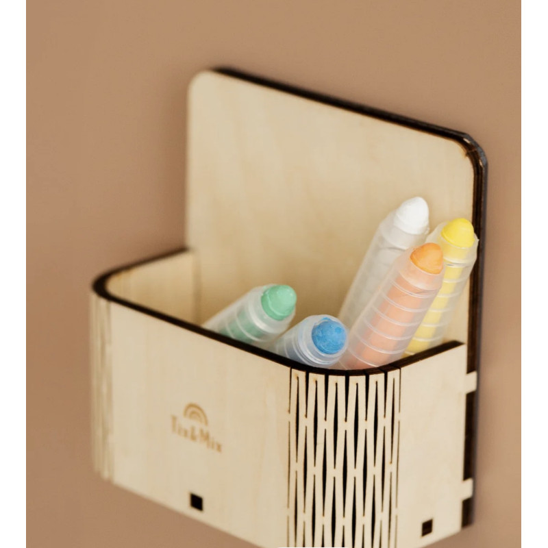 Gardez les moments de jeu bien rangés et agréables grâce à la boîte magique Tix&Mix — une boîte de rangement magnétique en bois qui permet de ranger crayons, pièces magnétiques et autres petits trésors directement sur votre tableau mural magnétique Tix&Mix .
