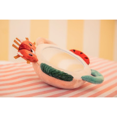 Un miroir étonnant entouré d'activités toutes douces pour éveiller bébé ! Allongé sur le ventre, il s'amuse à découvrir son reflet et à explorer les petits jeux sensoriels qui l'entourent. Le miroir peut aussi se suspendre grâce à une boucle discrète, pour accompagner bébé partout.