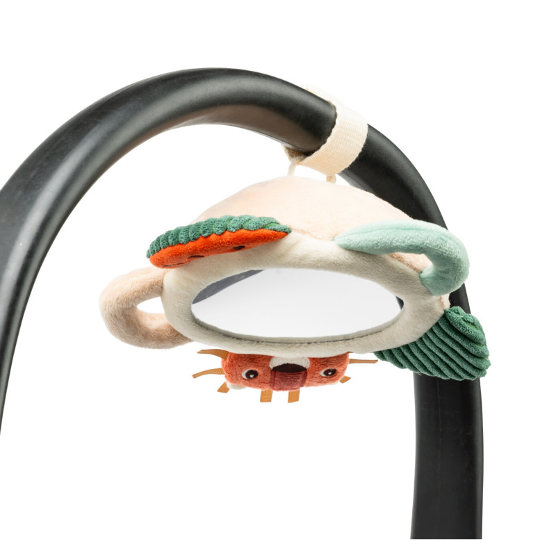 Un miroir étonnant entouré d'activités toutes douces pour éveiller bébé ! Allongé sur le ventre, il s'amuse à découvrir son reflet et à explorer les petits jeux sensoriels qui l'entourent. Le miroir peut aussi se suspendre grâce à une boucle discrète, pour accompagner bébé partout.