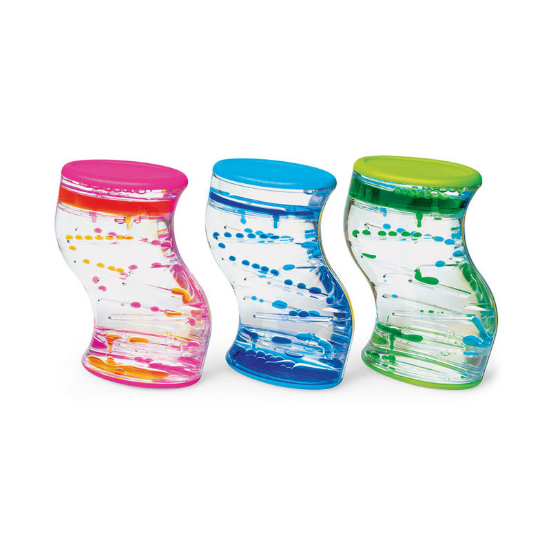 Des gouttes colorées... glissent vers le bas en zigzag comme une piste de billes. Cela fonctionne parce que les deux liquides, l'eau et l'huile, ne se mélangent pas. Si vous retournez l'étui, le jeu apaisant recommence.