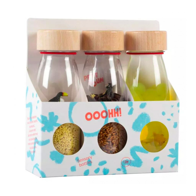 Les bouteilles sensorielles Petit Boum respectent les normes européennes les plus strictes et peuvent être manipulées et mâchouillées en toute sécurité. De plus, elles sont incassables et parfaitement scellées grâce à un système de double bouchon. Elles sont fabriquées à partir de plastique recyclable, d'éléments naturels (riz haché et vermicelles colorés, grains de maïs etc.), de petites figurines et d'un bouchon en bois d'érable, le plus résistant et flexible. 90% des fournisseurs sélectionnés par la marque sont locaux afin de réduire l'impact environnemental des bouteilles.