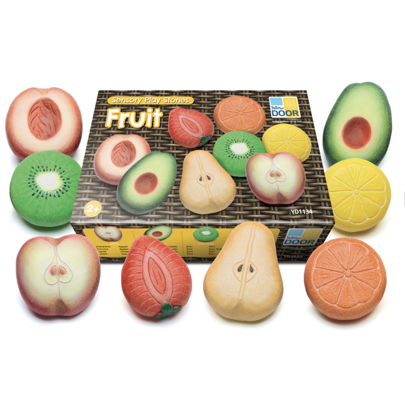 Tout droit sortis de la cuisine de boue ou du jardin, ces galets sont parfaits pour préparer salades de fruits, smoothies et tartes. Résistants à toute épreuve, ils retrouveront leur éclat d'origine après un simple nettoyage. Les enfants trouveront mille et une façons de cuisiner et de servir ces délicieux galets texturés, pour des repas tout au long de l'année. Le set comprend huit fruits colorés : pomme, poire, pêche, fraise, avocat, kiwi, orange et citron. Dimensions : 45 à 70 mm. À partir de 2 ans.