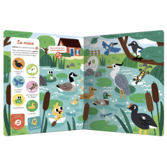 Sur chaque double-page, il observe et écoute attentivement pour retrouver 6 animaux et une mascotte qui se cache chacun des univers : la basse-cour, l'étable, le pré...