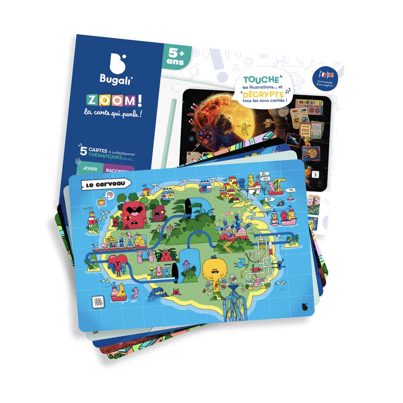 Votre enfant part à la conquête de savoirs, de sons, de jeux et de missions à travers 5 cartes interactives recto-verso texturées. Chaque carte s'anime en français et en anglais lorsqu’elle est utilisée avec la console Bugali, pour s'amuser tout en apprenant !