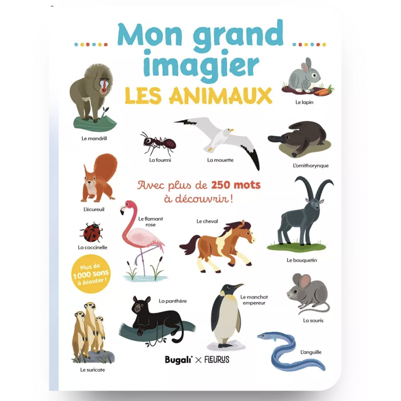 Un imagier de Claire Wortemann (Fleurus), adapté par Bugali, pour apprendre les noms des animaux (fr/en) de tous les continents, savoir les reconnaître et... jouer et chanter ! Cet imagier n'est pas comme les autres ! 9 grandes scènes à regarder, plus de 250 mots à entendre et à apprendre, des comptines à chanter, 1 grand cherche et trouve pour s’amuser, et des centaines de sons pour découvrir le monde des animaux ! Ce livre contient 1000 mots et des musiques, dialogues, jeux, comptines, définitions, bruitages.